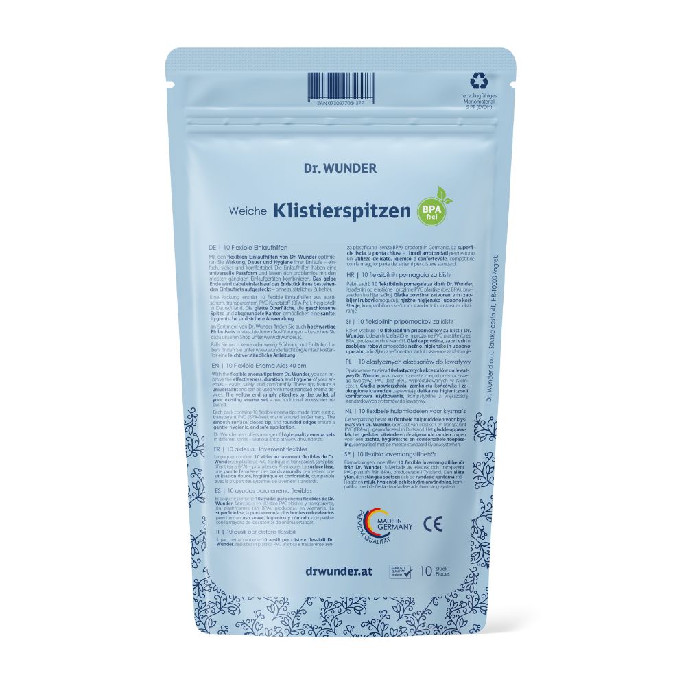 Die Klistierspitzen von Dr. Wunder sind perfekt für alle, die bei ihrer Körperpflege auf Sicherheit und Komfort setzen. Ob als Unterstützung während einer Fastenkur oder für die regelmäßige Pflege – sie machen Einläufe zu einer angenehmeren und unkomplizierteren Erfahrung.