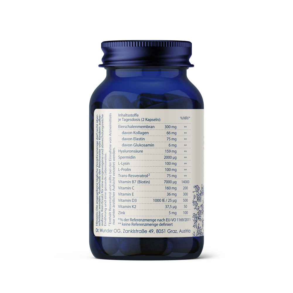 Ergänzt wird die Rezeptur durch Hyaluronsäure, Spermidin, die Aminosäuren Lysin und Prolin sowie Resveratrol, die gezielt auf Zellerneuerung, Elastizität und antioxidativen Schutz wirken. Biotin, Zink und die Vitamine D, E und K2 fördern zusätzlich die Gesundheit von Haut, Haaren, Nägeln, Knochen und Gefäßen.