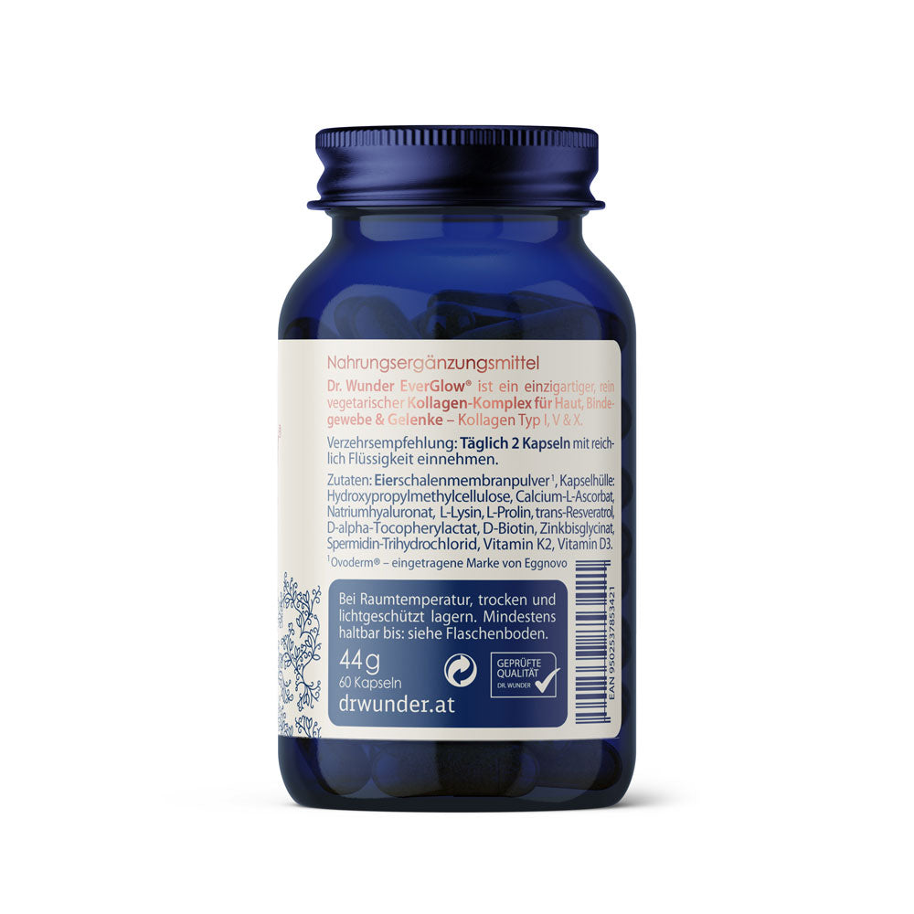 Dr. Wunder EverGlow® Superior-Kollagen ist ein Premium-Komplex, der vegetarisches Kollagen aus Eierschalenmembran mit sorgfältig ausgewählten Mikronährstoffen verbindet. Das Kollagen liefert die Typen I, V und X, die entscheidend sind für Hautstruktur, Bindegewebe, Elastizität, Gelenke und Knorpelaufbau.